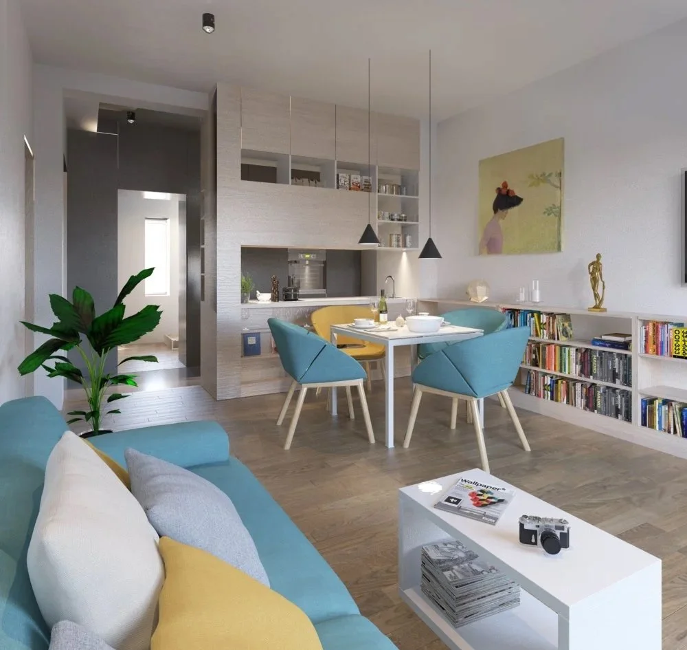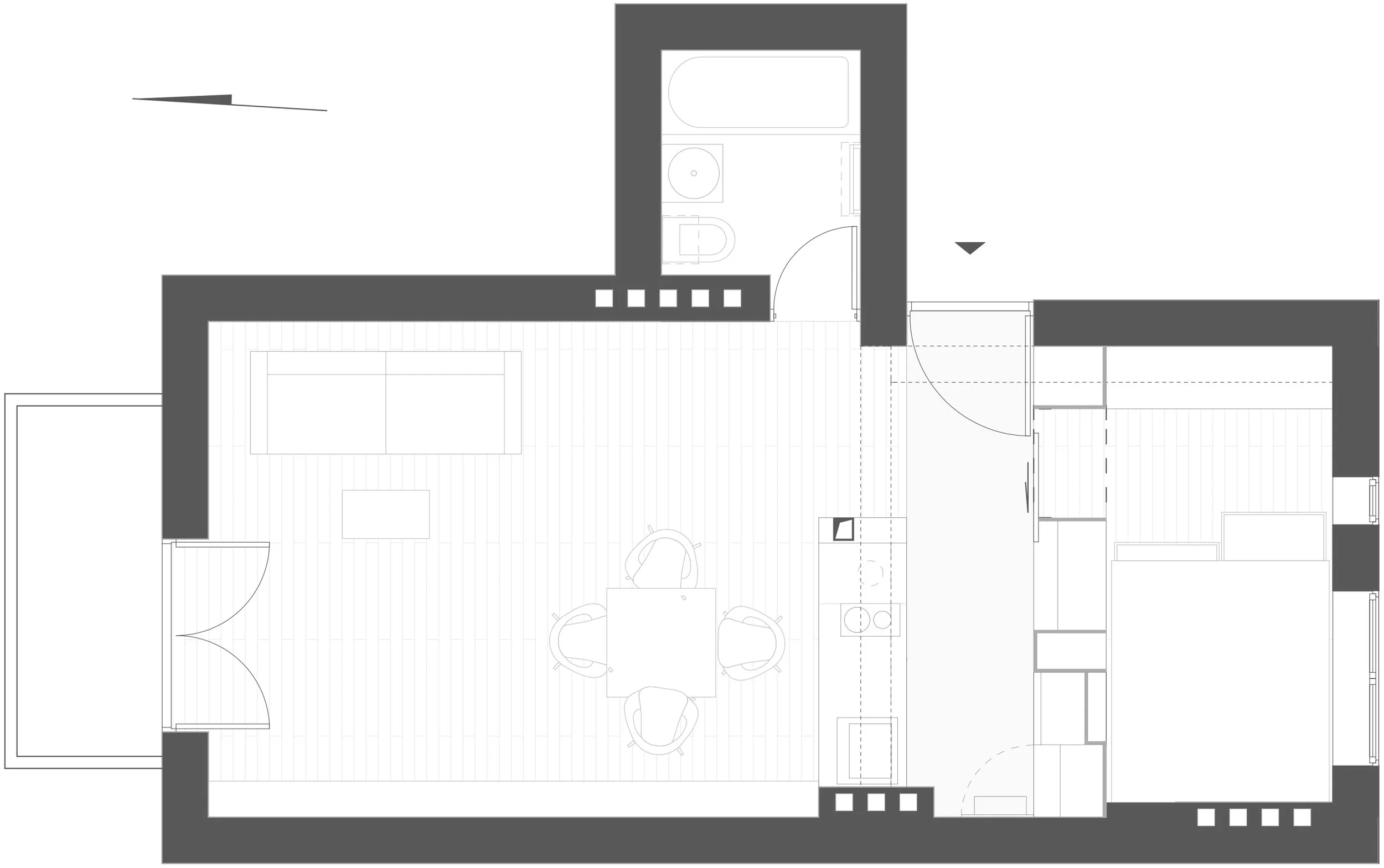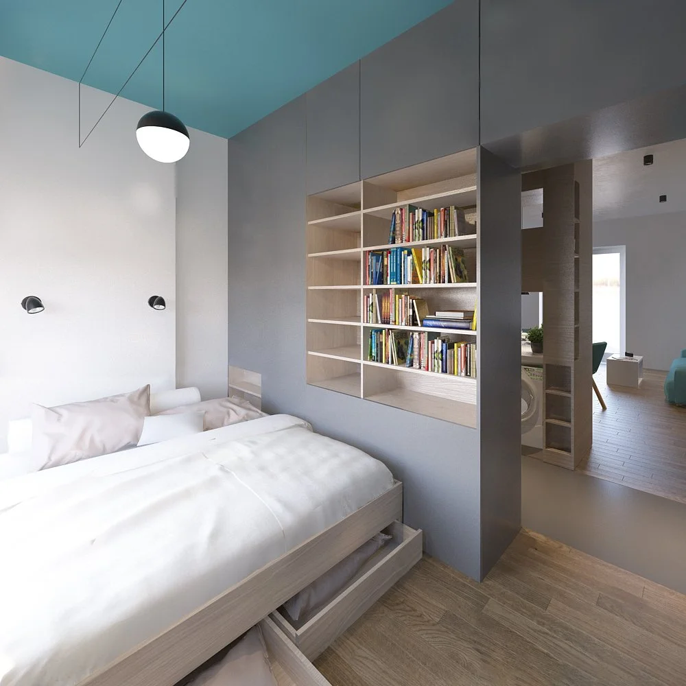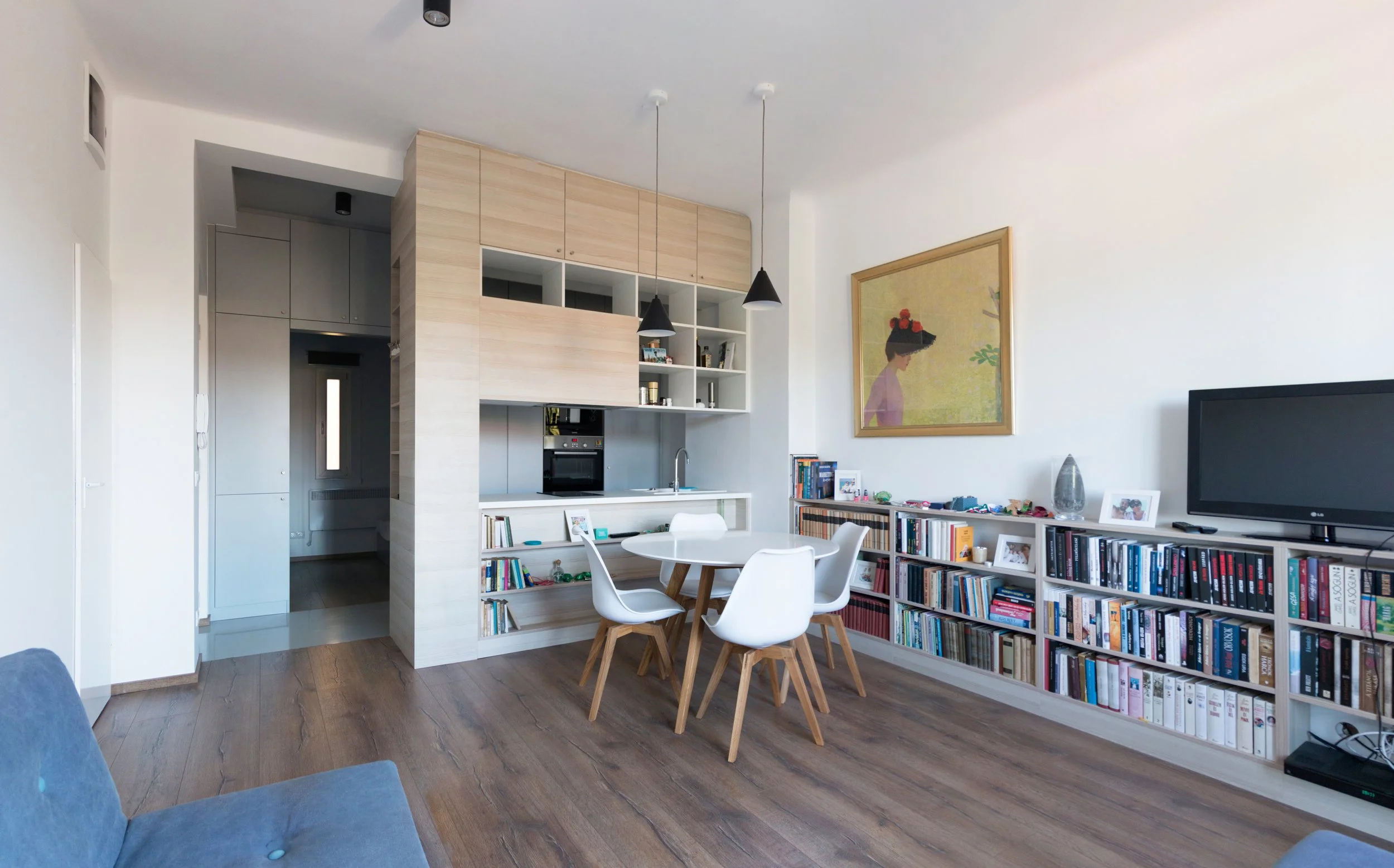 A lakás fő térosztó eleme egy multifunkcionális bútorfal, mely markáns határvonalként osztja a privát és a közös tereket. Így jöhetett létre egy kuckós hálószoba, annak minden funkcionális igényével és egy jól működő konyha-étkező-nappali térsor a meglehetősen kompakt alapterületen.