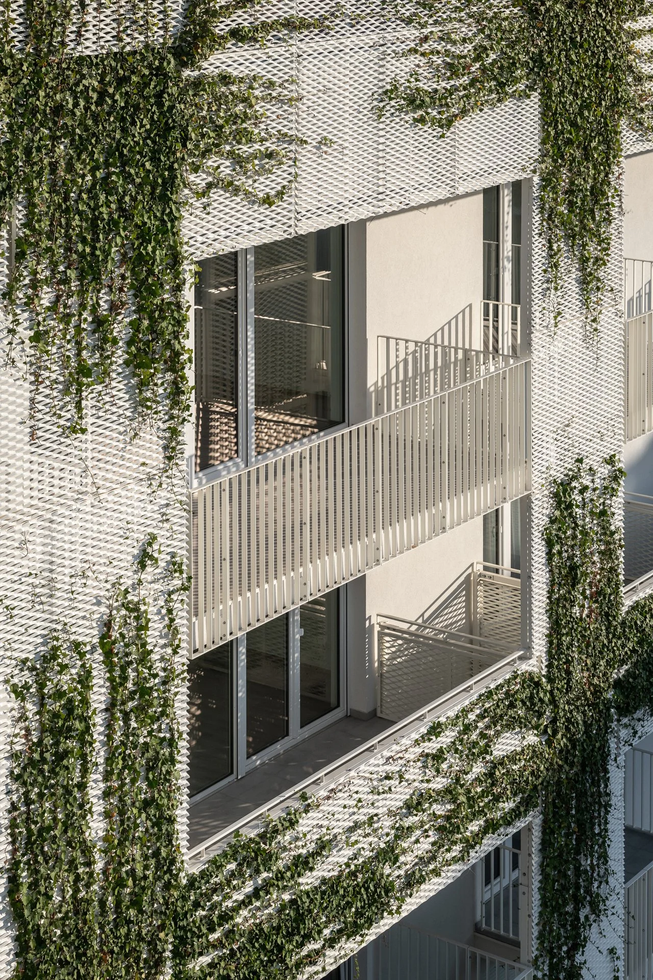 Ezeken felül a 4. emeleti 5 db tetőkert mellett a záró tetőszinti park gazdagítja a zöldfelületet. A ház fő karakterét pedig a felső tömegek homlokzatát, külső héjként körbe ölelő futtatott zöldtakaró adja, mintegy 7.000 m2-en.