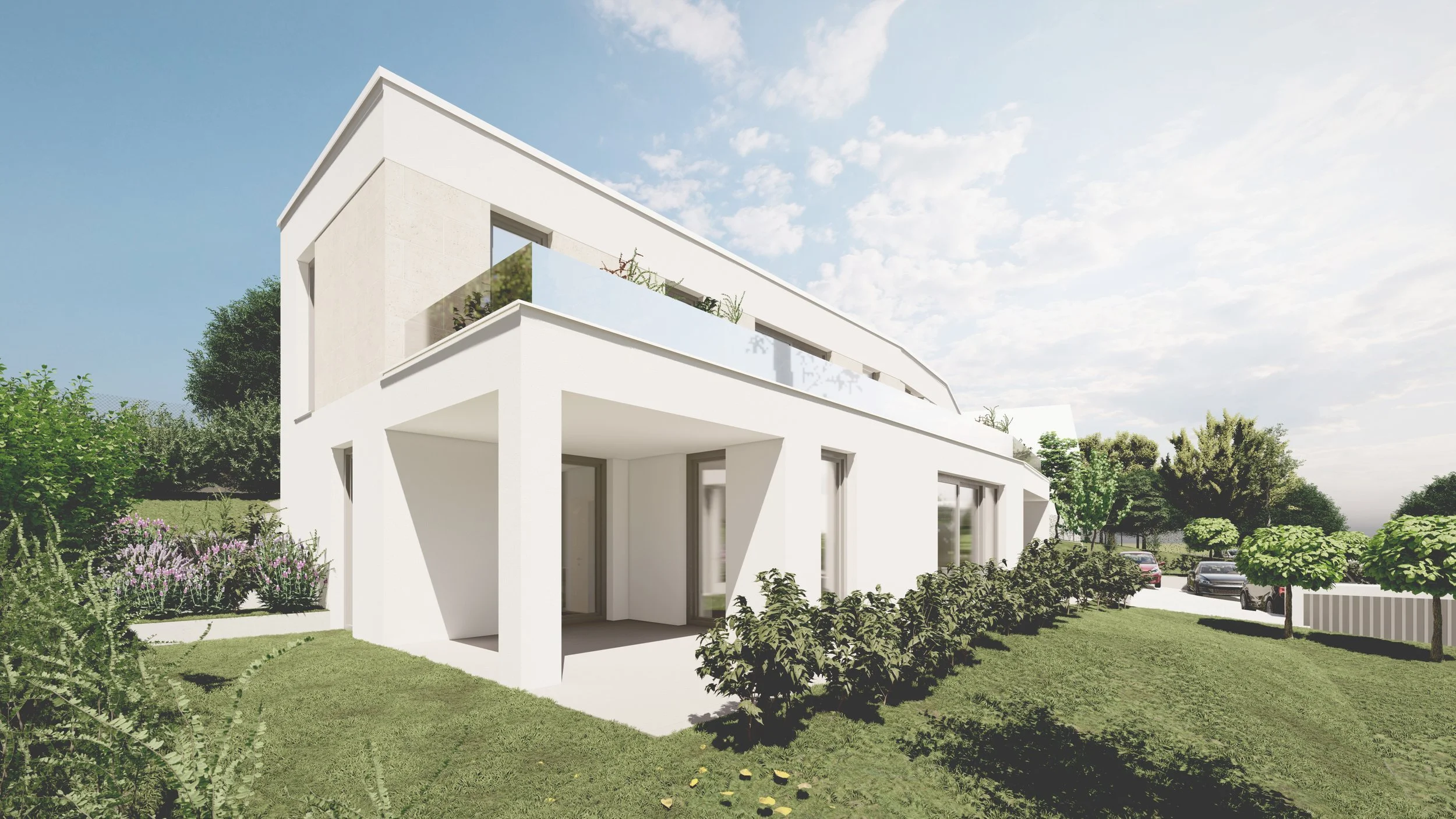 Balatonalmádi lejtős hegyoldalába terveztünk egy a tóra néző panorámás, négy lakásos apartmanházat.