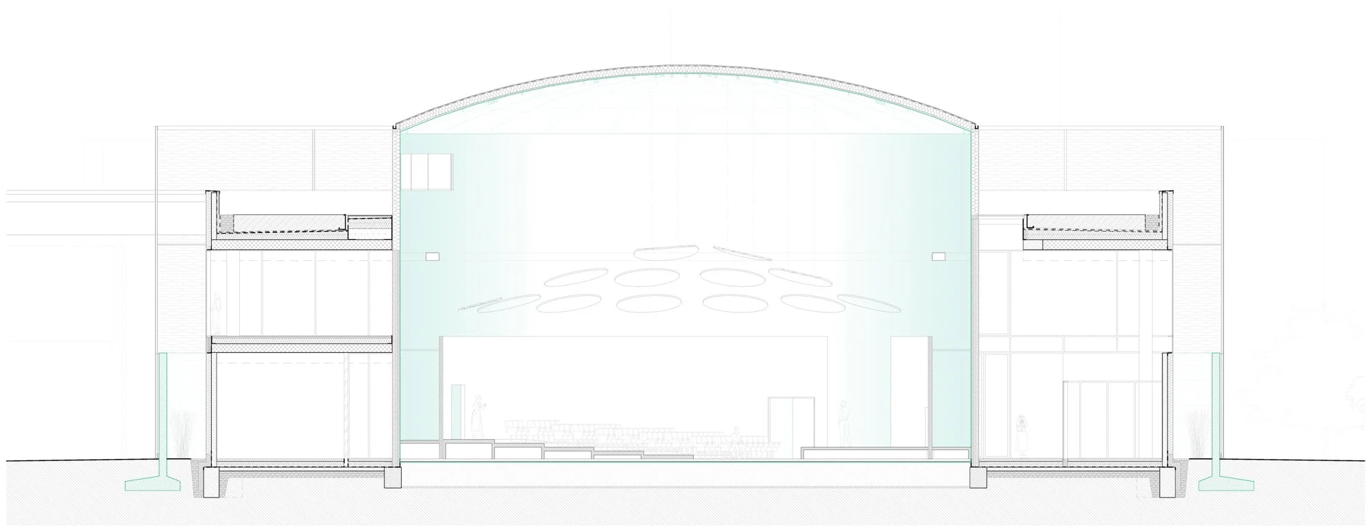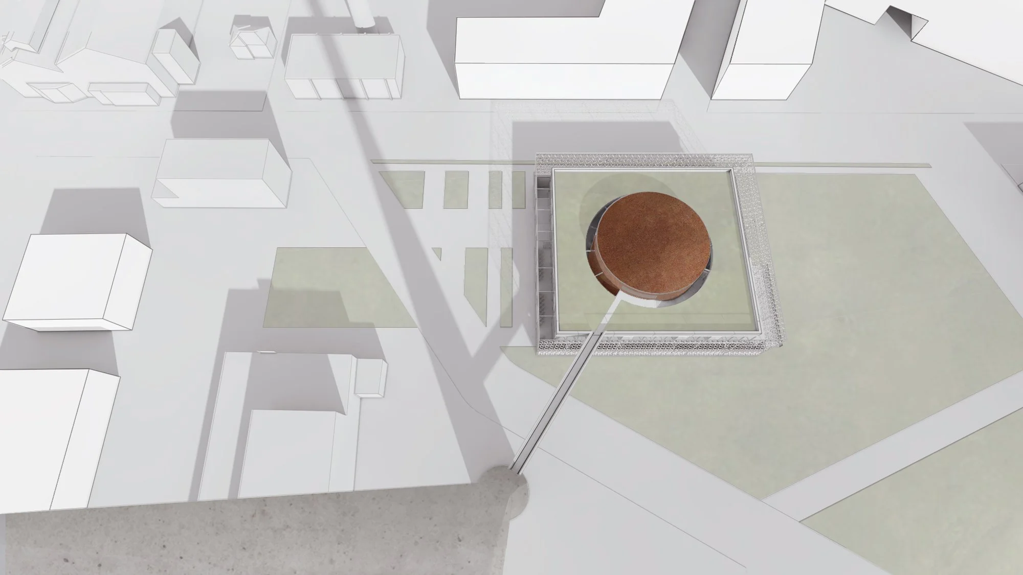 Az épület magja a tároló. Az azt körülvevő vasbeton kármentő fal külső keretként fogja körbe a leendő épületet, melyre a hártyaként feszülő, égtájanként változó áttörtségű acélháló hívogatóan hat. Az anyaghasználat monokróm környezetet biztosít, amibe egyedüli hangsúlyként a rozsdás acél tároló kerül.