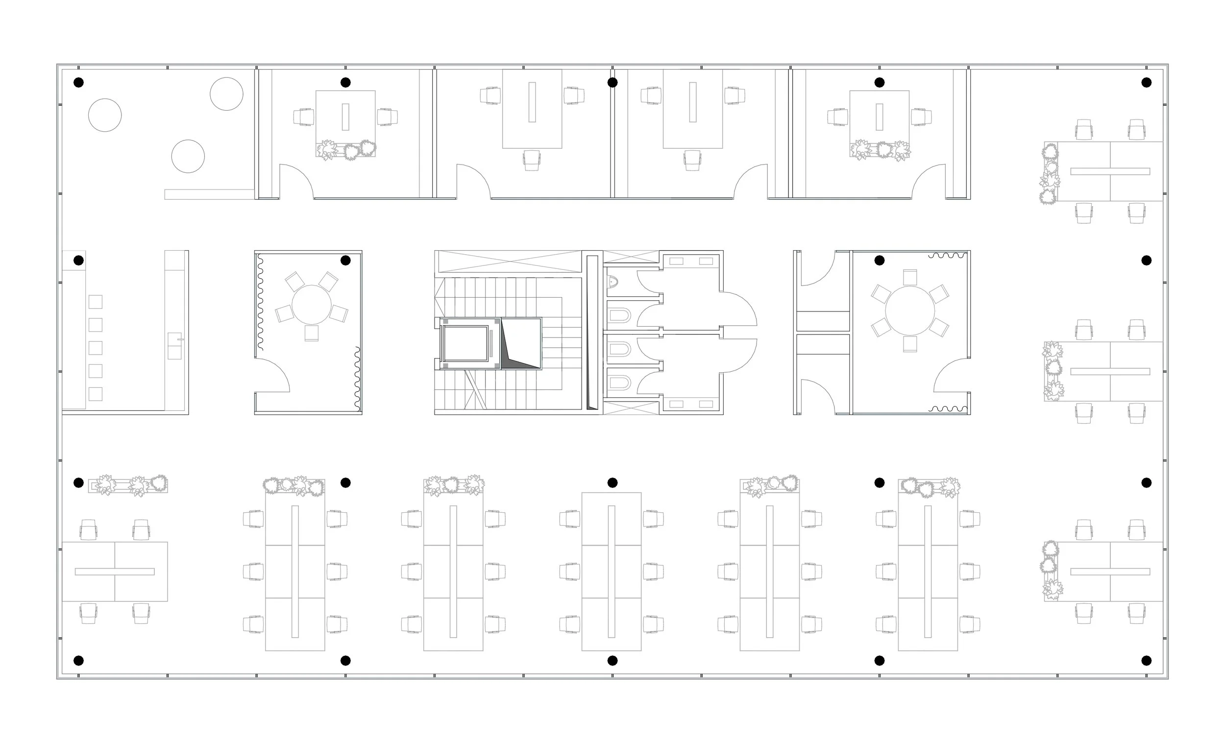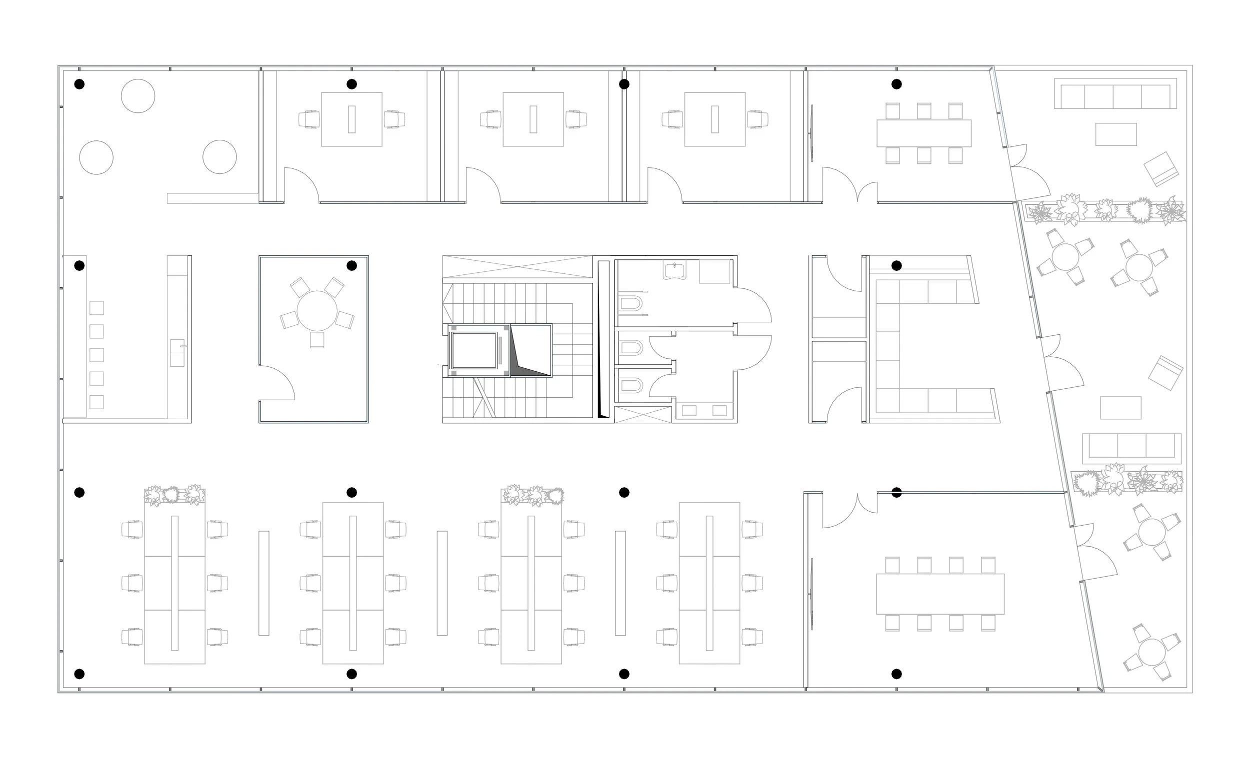 A kiszolgáló és közlekedő területek egy központi mag köré szerveződnek, így a homlokzati sávban egy jól megvilágított, nyitott irodatér jöhetett létre. Ennek eredményeként különböző méretű és elhelyezkedésű irodák, tárgyalók és rekreációs zónák alakíthatók ki, a megrendelői igényekhez igazodva. A térszervezési koncepció részeként arra törekedtünk, hogy a munkaállomások, fókuszterek és közösségi terek aránya ideális egyensúlyt teremtsen a koncentrált munkavégzés és az együttműködés támogatása között.